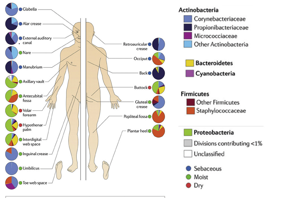 Das “Human Microbiome Project” hat die Zusammensetzung des Mikrobioms erforscht und untersucht, wie sich Veränderungen auf Gesund- und Krankheit auswirken. Auch wenn das Mikrobiom eines jeden Menschen unterschiedlich ist, konnte das Projekt zeigen, dass die Haut von etwa 10.000 verschieden Arten von Mikroorganismen besiedelt und die Zusammensetzung dieser Besiedlung in den unterschiedlichen Körperbereichen individuell ist (Abb. 1). Dabei wird deutlich, dass die Bakterien auf den von ihnen besiedelten Bereich des Körpers spezialisiert sind und somit einen optimalen Schutz bieten (1).